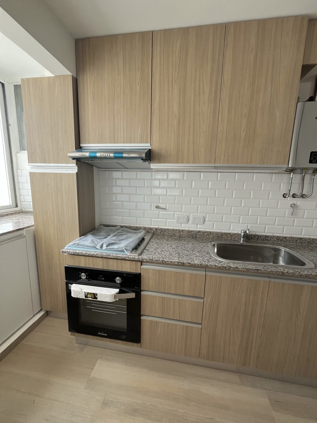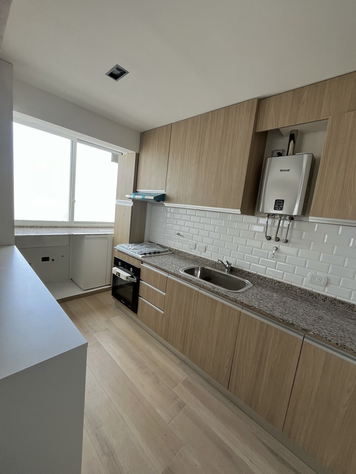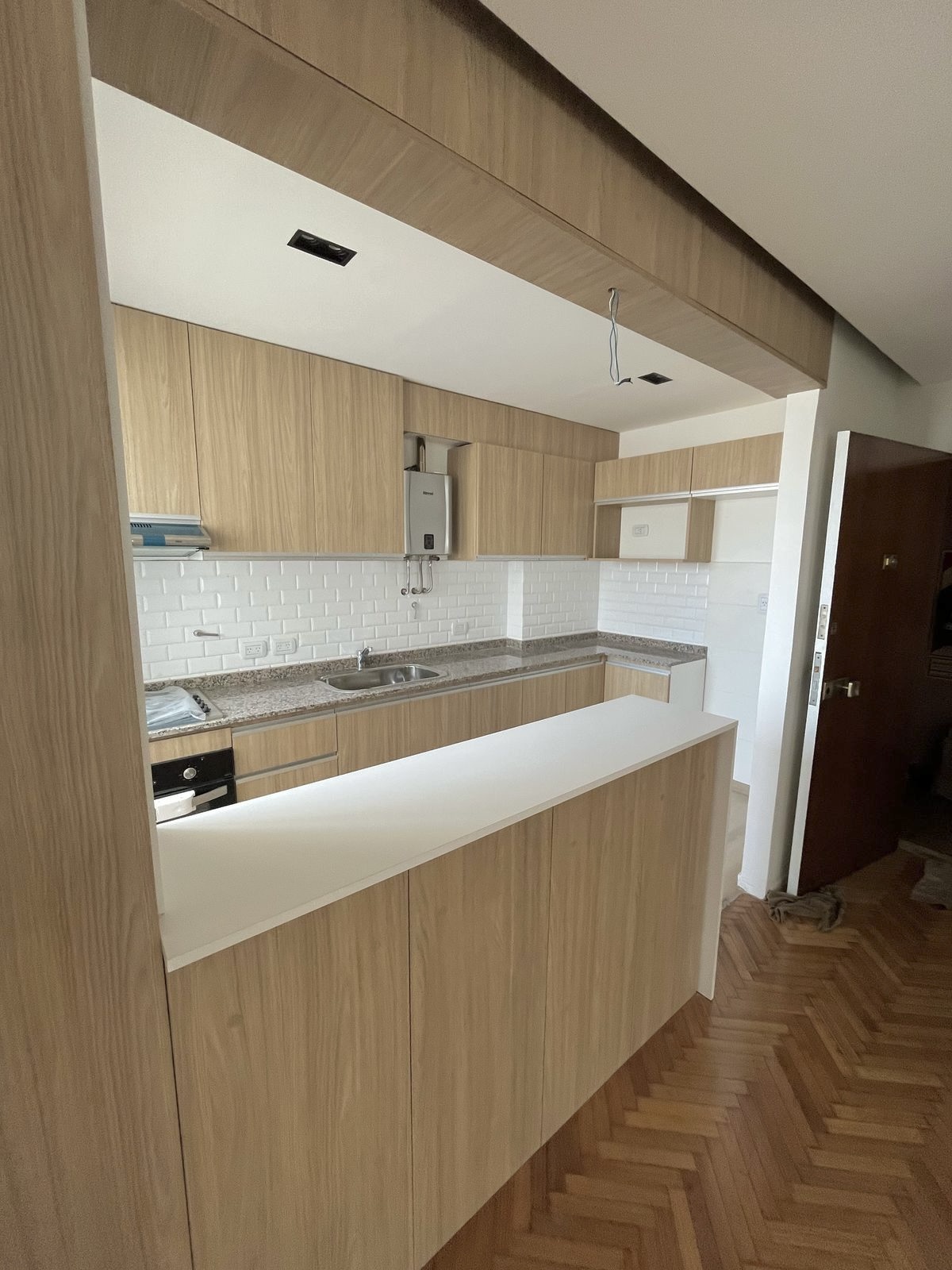 Cocina integrada, con abundante espacio de guardado y conexión para lavarropas.